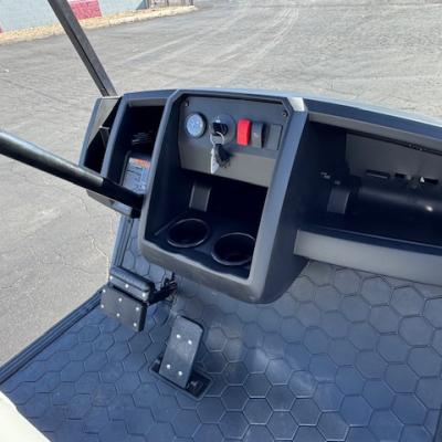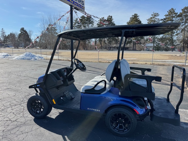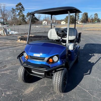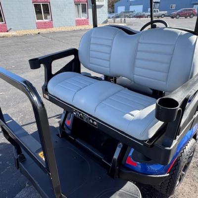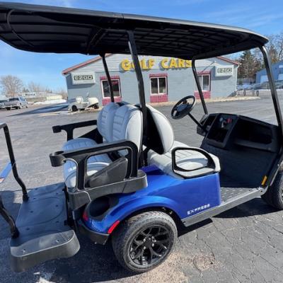 The very popular EZGO Express S4 Gas cart with the Kawasaki 400 cc motor and beautiful Electric Blue paint and upgraded premium seats!