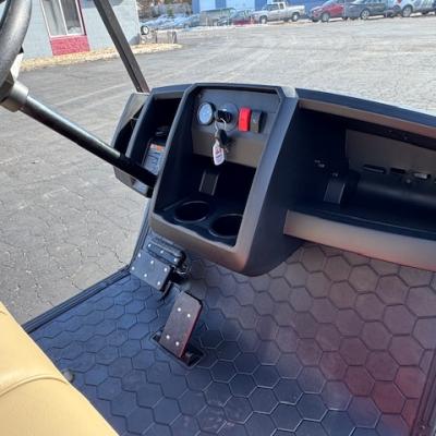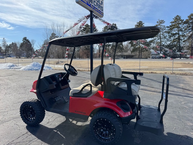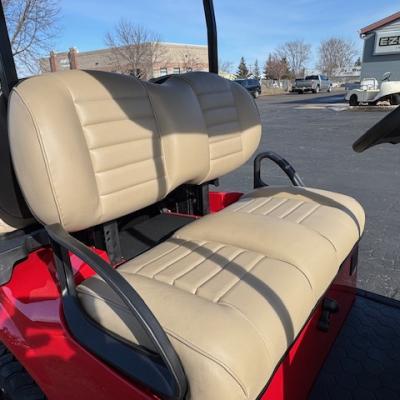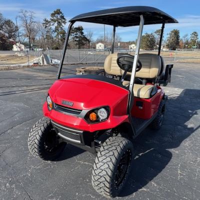 This fantastic Flame Red S4 gas cart has a 4" lift, premium seats, storage box under the rear seat, lights, horn, fuel gauge, hour meter, fender fares, mirror, windshield and upgraded wheels!