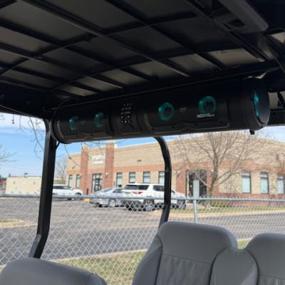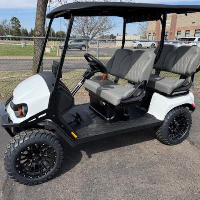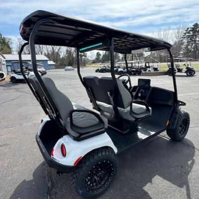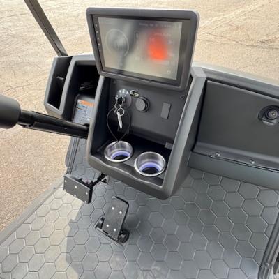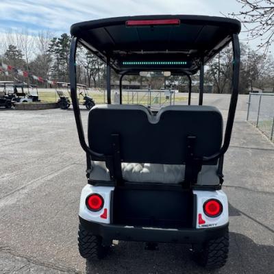 The Liberty has 4 forward facing seats! This cart has signature seating, a Samsung lithium battery with an 8 year warranty, an Ecoxgear soundbar and 10" screen, turn signals, reverse camera, fender flares and a brushguard, locking glove boxes, a mirror and a windshield.